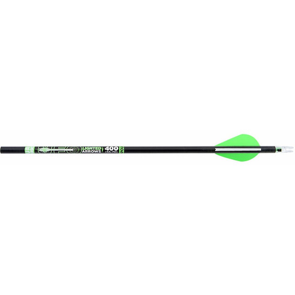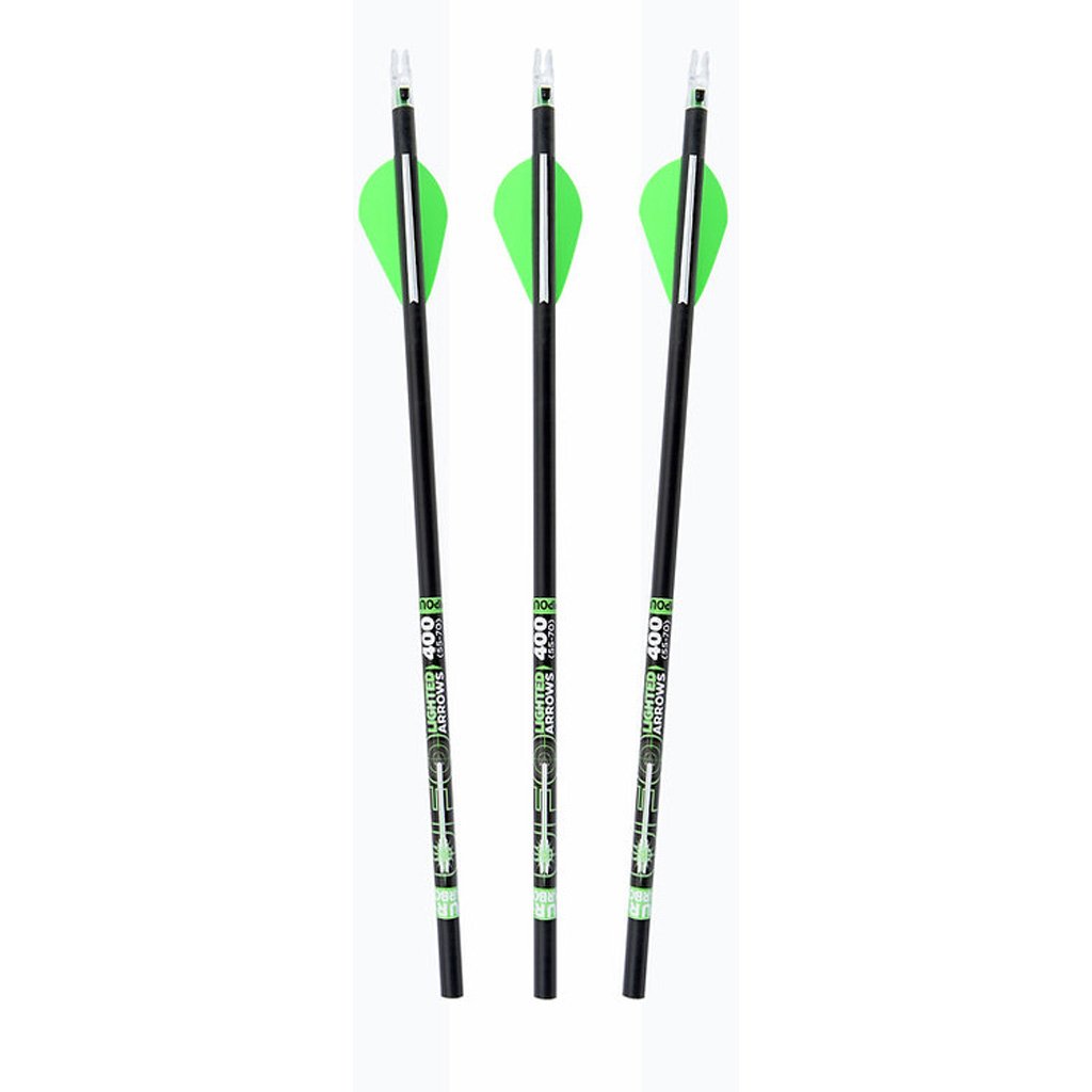 The UFO Lighted 30 inch Compound Arrows 3 Pack features pure carbon arrow construction with a lighted green nock for improved visibility and shot tracking. Each arrow includes 2 inch Blazer style vanes and delivers +/- .003 straightness for consistent accuracy and reliable flight. Inserts are included but not installed, allowing customization to match individual setups. Packaged in a clam pack for convenient display, these arrows offer dependable performance and durability.