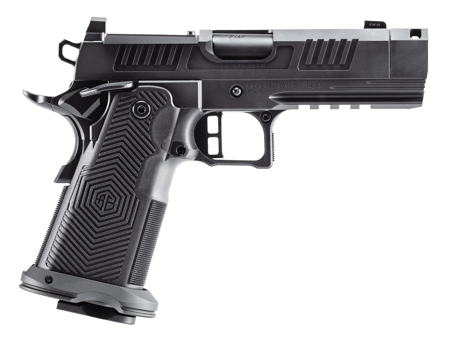 The AF1911 Romulus is hammer fired featuring a SUS416 black polished DLC finish on the frame and slide; Bull ramped, pressed compensated barrel; injected polymer grip module; extended beavertail, Double Stack magazine; glowing night sights; extended slide release: flared magwell; Picatinny rail; RMSC optics cut; ambi thumb safety. Includes MOS adapter plate, RMSC and RMR plate, two 10rd magazines.