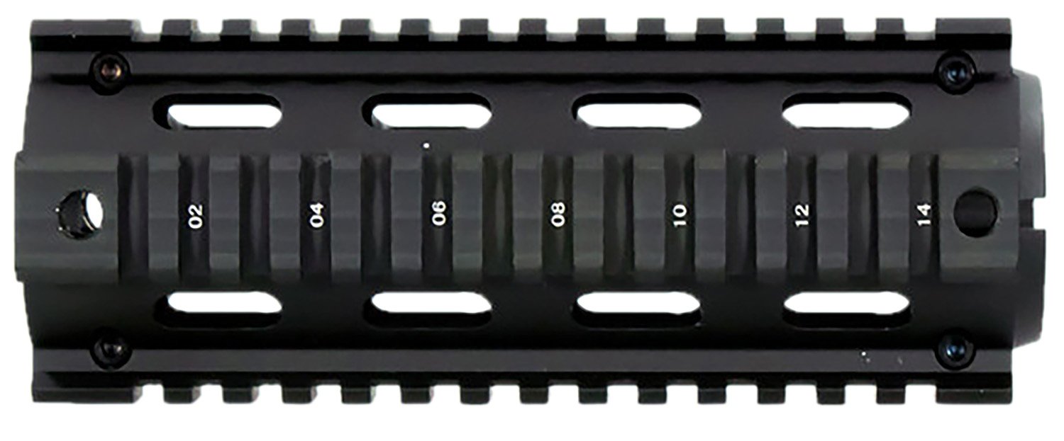 This M4 carbine-length, drop-in quad rail by Aim Sports is an easy to install upgrade for the basic carbine. Made from aircraft-grade aluminum, it is compatible with most carbine-length direct impingement gas systems. The two-piece design requires no gunsmithing to install and is compatible with all standard Weaver/Picatinny 1913 accessories.