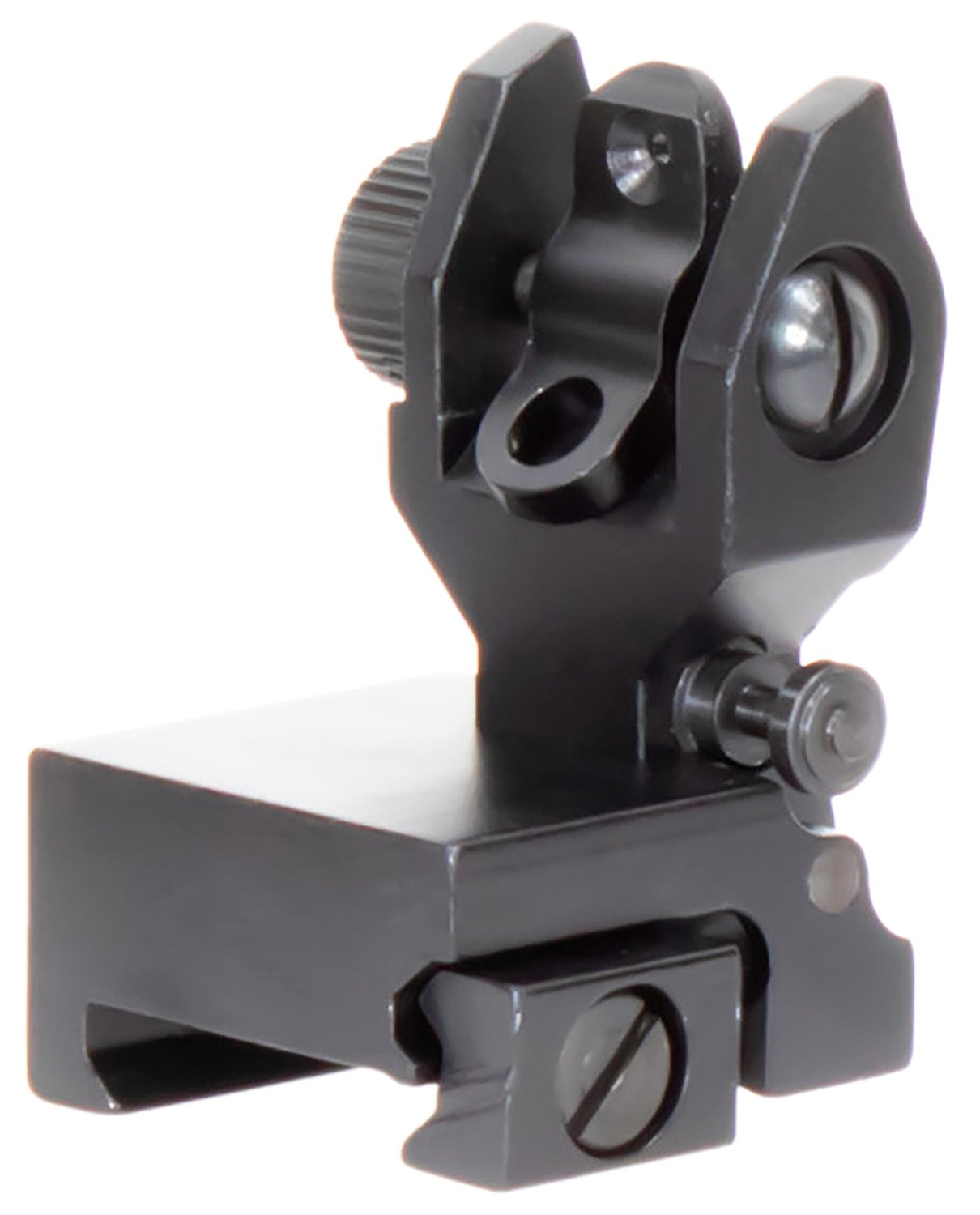 Aimsports AR-15/M4 flip up rear sight feature dual aperture for long and short range, ball bearing pivot detent, automatically locks into position when raised, flip-up posi-lock design to guarantee zero and A2 style dual aperture, Small Aperture: 0.070″, Large Aperture: 0.200″. 0.65 MOA on M-4 type rifles and 0.49 MOA on A-4 type rifles.