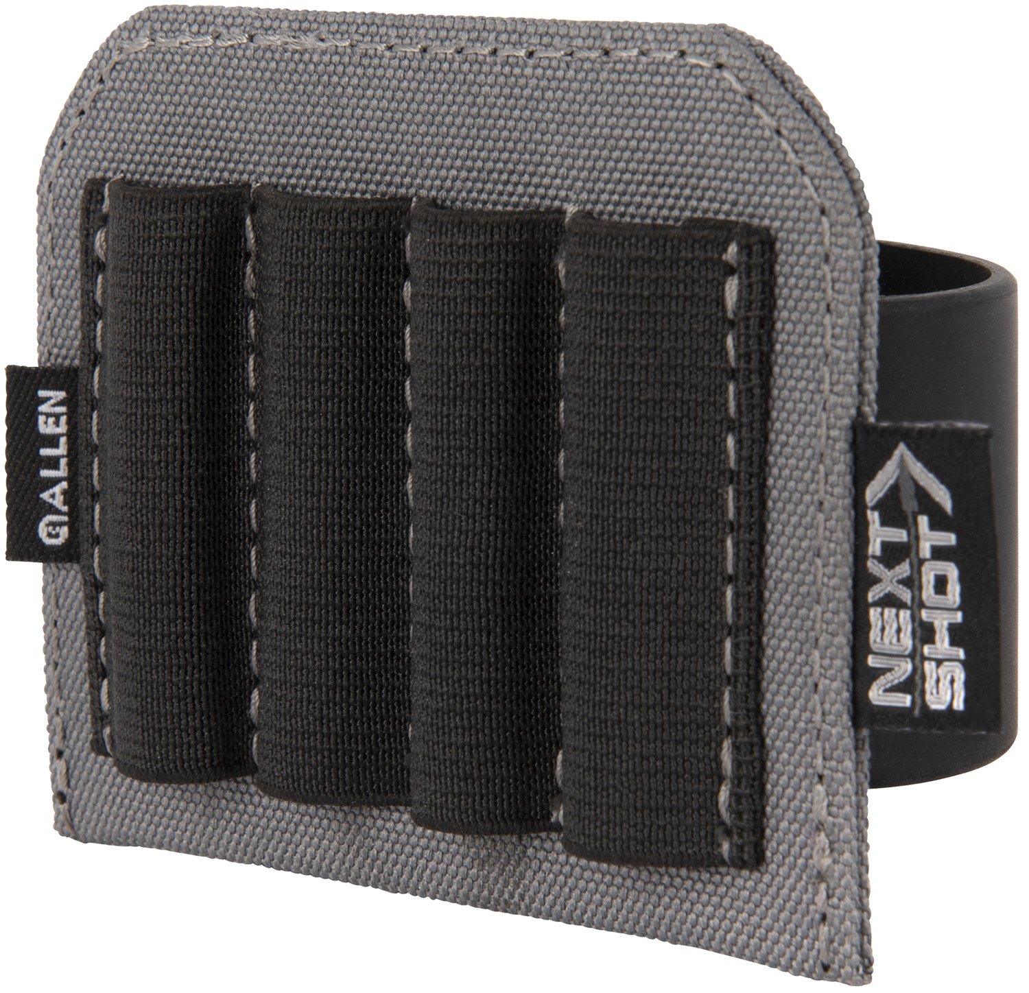 Next Shot Rifle Cartridge Carrier, Buttstock Attached. The Rifle Cartridge Carrier uses a silicone band to attach to the rifle stock. The silicone band is elastic enough to fit over most stocks. It holds 4 rifle cartridges in a ready position. The elastic cartridge loops work for calibers .223 to 300 Winchester Magnum.