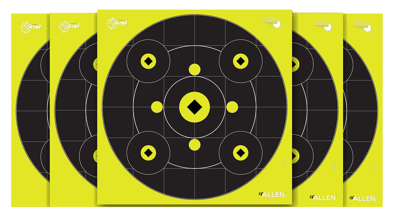 The EZ Aim Splash Target is designed to show the shooter the impact of the bullet by creating a bright white halo around the bullet hole. The target face features a center bullseye plus a gallery of 8 small aiming point evenly distributed around the target. A grid pattern made of 2″ grids aids in scope and sight adjusting 12.5″ x 12.5″ target face. 12 pieces per pack.
