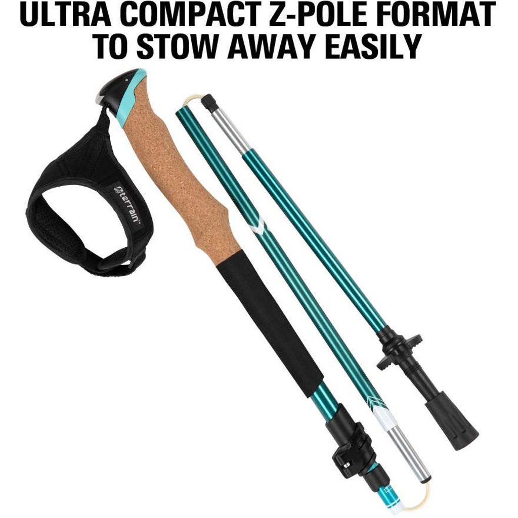 The Terrain Alpha Trekking Poles have a compact Z-pole design folds up small and provides an easy to stow-away format for your pack. Aluminum construction is strong but lightweight, while neoprene wrist straps are padded for your comfort during use. A cork upper grip helps streamline your trekking poles for easy packing