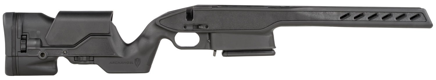 The Archangel AAS111MLA is an aluminum pillar bedded, fully adjustable precision stock for Savage Model 1100/111 long action rifles (and variants). Features an ergonomic gooseneck style grip with palm swells and a locking storage compartment. The comfortable, ventilated forend is contoured and textured for positive retention and features two M-Lok slots on the bottom for mounting accessories such as a rail, bi-pod or light. The click adjustable cheek riser, with a 1.25″ travel in .05″ increments, assures a proper fit to each individual. The buttstock features a textured, contoured recoil pad and off-hand pressure hook. The varmint-barrel sized barrel channel accepts and free-floats most barrel contours. Also, features three steel QD style flush fit hard points for QD style sling swivels (sling swivels not included). The will withstand all standard gun solvents and oils. Includes one TYPE C- Archangel Long Standard Caliber, a traditional style sling stud (not installed) for using a standard sling swivel on the forend or for mounting Harris style bipods, Hex head action screws and Allen wrench.