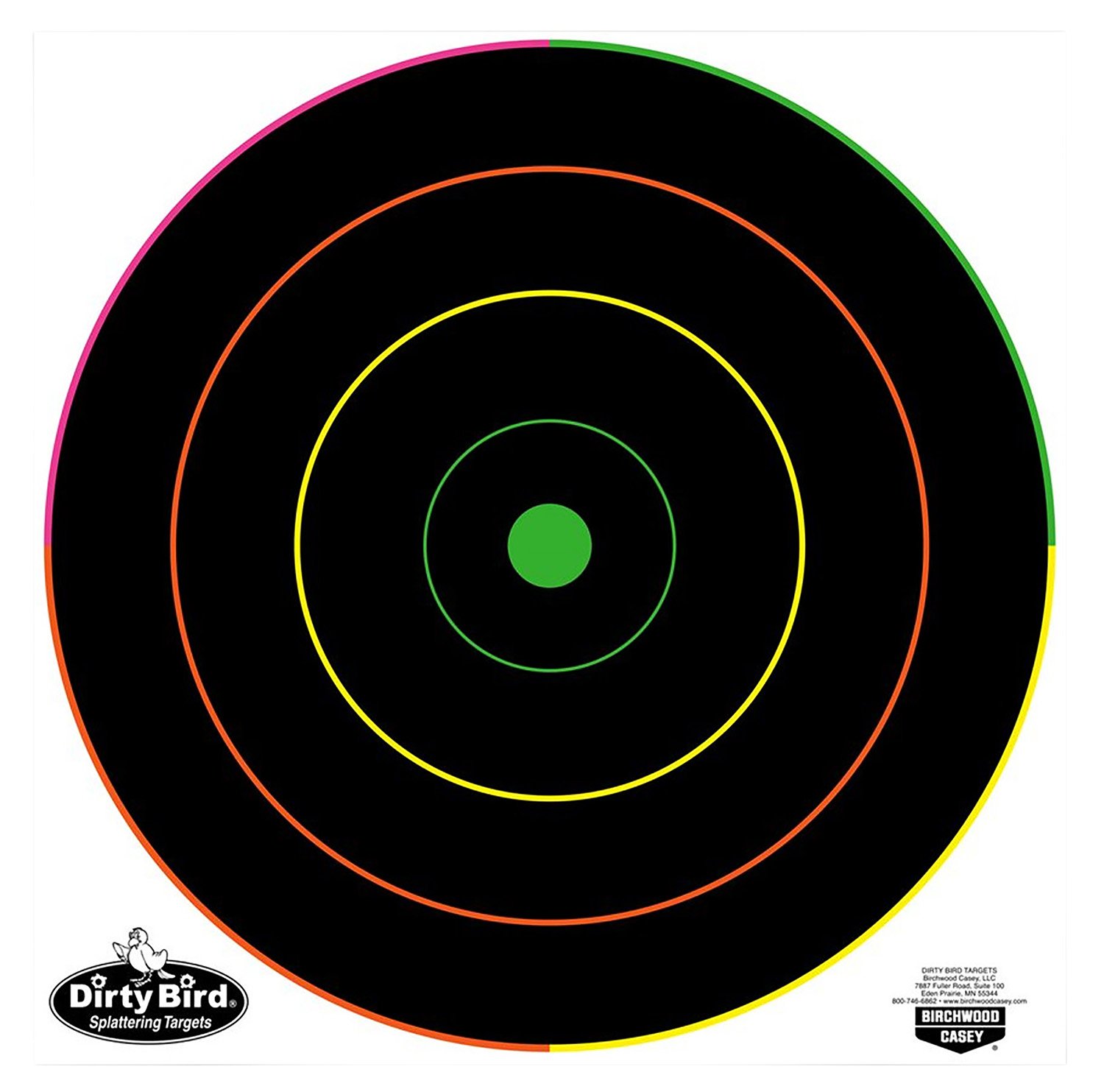 Birchwood’s Dirty Bird Multi-Color Splattering Target features the idea the same as the standard Dirty Bird targets’ the name comes from the splatter of color that appears upon bullet impact, which makes the hole highly visible even at a distance. The concentric circles of the bulls-eye each have its own color splatter, so you can tell by the color how close you are to the center. Heavy tagboard construction makes these targets extra durable, and the non-adhesive back allows you to affix to a surface as you wish, add notes and then easily save the target for future reference.
