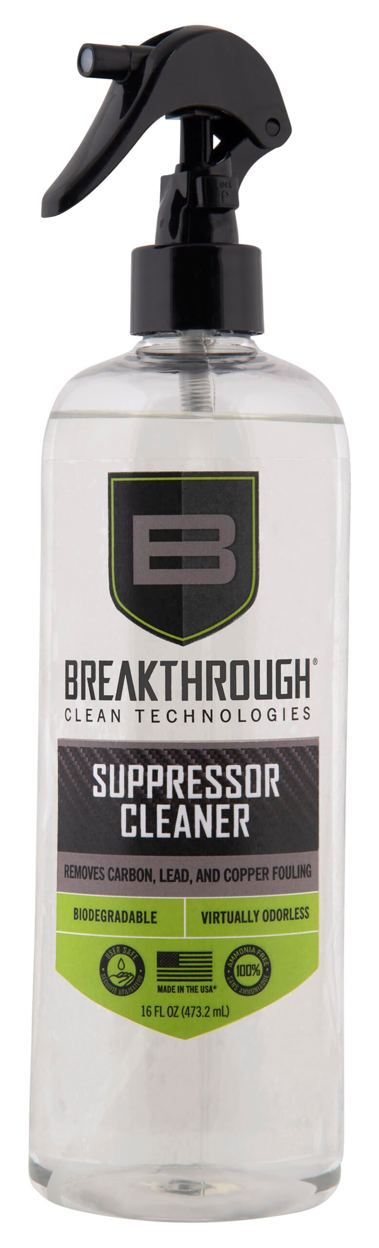 Breakthrough Clean Technologies Suppressor Cleaner is a water-based, ammonia-free cleaner that uses a proprietary blend of detergents and surfactants to remove heavy carbon, lead copper build-up from your suppressor, muzzle brake, compensator, and flash hider. * For best results, soak suppressor in cleaner for 8-24 hours.