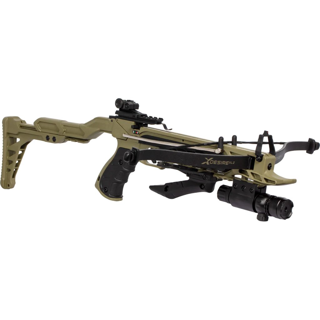 The Desire XLZ Mini Crossbow packs power and precision into a compact, easy-to-handle design. With its break barrel cocking device, loading is quick and effortless, while the adjustable stock extends up to 2.5 inches for improved comfort and control. Equipped with both a premium laser sight and open sights, it ensures accurate, confident shooting every time. Delivering 175 FPS with a 60-pound draw weight, the Desire XLZ includes three premium bolts, making it ideal for backyard shooting and target practice.