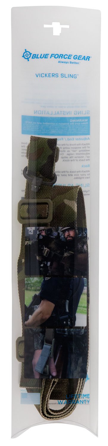 Blue Force Gear’s Vickers 221 Sling allows users to switch from 2-point to 1-point mode instantly. The sling is constructed of Invista solution dyed Cordura webbing with ITW GhilleTex Acetal hardware. A standard push button swivel and polymer molded Burnsed Socket are woven onto the allowing full adjustability. It is compatible with any weapon with two QD sling swivel sockets with the rear socket towards the end of the receiver. This unpadded model has a MultiCam finish.