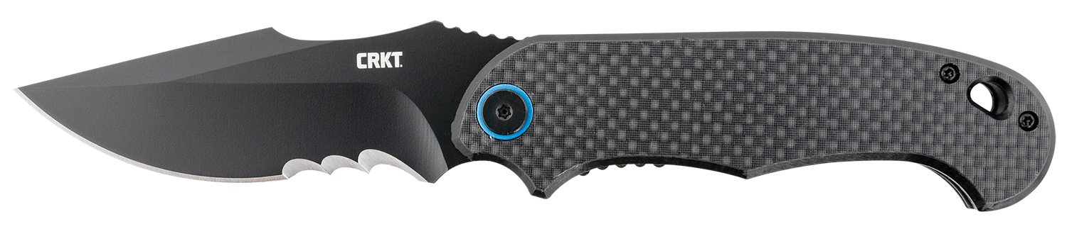 The P.S.D. re-curve of the blade performs when making deep cuts and slicing, the Veff Serrations breezes through rope and cord, while the double grind makes pushing more efficient. The surprisingly compact G10 and carbon fiber handle accommodates a solid four-finger grip and is finished with an electric blue pivot and pocket clip.