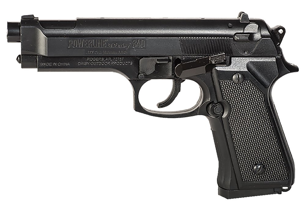 For hours of fun on the range and basic training for pistol shooters, Daisy’s PowerLine Model 340 pistol is appropriate for adults and those ages 16 and older with adult supervision. The PowerLine 340 BB pistol is a spring-air pistol that features a 200-shot BB reservoir with a 13-shot Speedload Clip for pellets.