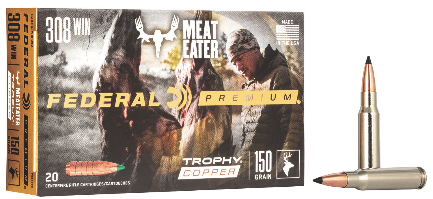The Federal Premium loads start with the finest primers, which are subjected to more frequent inspections for dimensional tolerances and charge weight to ensure they deliver consistent ignition for every shot. Next is the propellants, which are specially formulated to meet Federal’s stringent specifications. These clean-burning powders are of the highest grades in the industry. They’re consistent and reliable. Lastly, the casing. The precision-built cases in most centerfire Premium loads feature nickel-plated brass that defeats corrosion and aids in sleek, smooth extraction in even the most extreme conditions.Extract maximum performance from your favorite cartridge with Trophy Copper, the official rifle ammunition of MeatEater’s Steven Rinella. The loads provide pinpoint accuracy and aggressive expansion, yet the copper, polymer-tipped bullet retains up to 99 percent of its weight for deep penetration on a wide range of medium and big game. Specifications: 308 Win/150 gr/Trophy Copper (TC)/20 Per Box/10 Cs