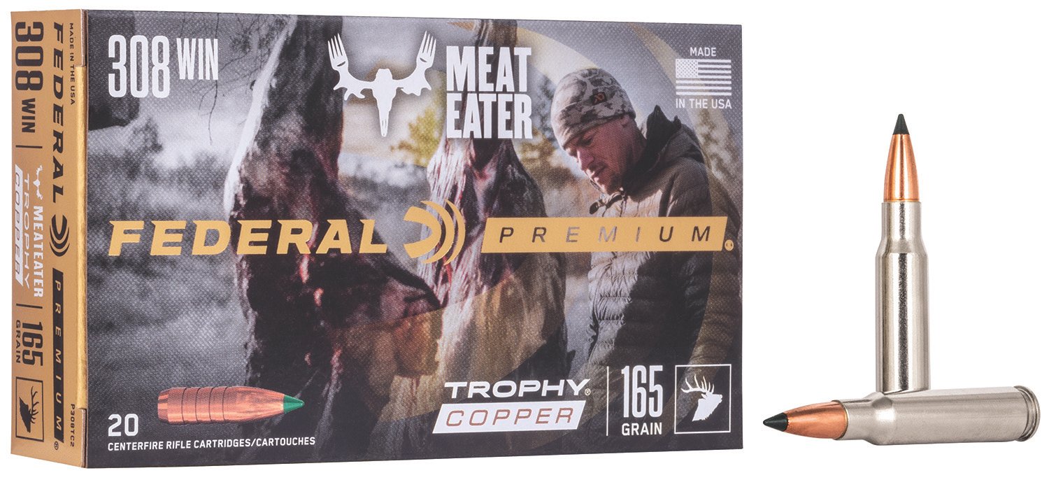 The Federal Premium loads start with the finest primers, which are subjected to more frequent inspections for dimensional tolerances and charge weight to ensure they deliver consistent ignition for every shot. Next is the propellants, which are specially formulated to meet Federal’s stringent specifications. These clean-burning powders are of the highest grades in the industry. They’re consistent and reliable. Lastly, the casing. The precision-built cases in most centerfire Premium loads feature nickel-plated brass that defeats corrosion and aids in sleek, smooth extraction in even the most extreme conditions.Extract maximum performance from your favorite cartridge with Trophy Copper, the official rifle ammunition of MeatEater’s Steven Rinella. The loads provide pinpoint accuracy and aggressive expansion, yet the copper, polymer-tipped bullet retains up to 99 percent of its weight for deep penetration on a wide range of medium and big game. Specifications: 308 Win/165 gr/Trophy Copper (TC)/20 Per Box/10 Cs