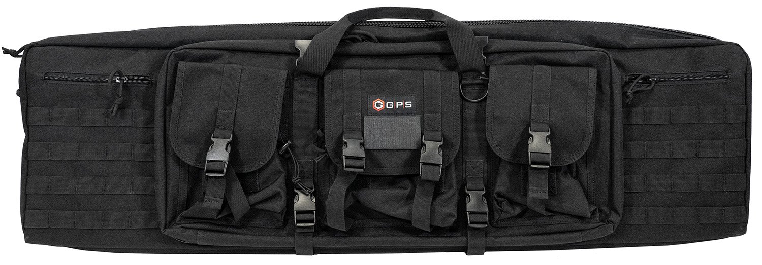 The Double Rifle Case features a main padded double rifle slots with Hook & Loop lockdown straps and full length padded divider. It also has an external double pistol pocket with two large padded pistol sleeves and two zippered pockets. The case is constructed of 600D polyester with MOLLE compatible webbing, woven cinch straps, side release buckles, and lockable zippers. The pistol pocket has external dimensions of 25.50″ L x 11″ H, while its internal pistol sleeve is 10″ L x 10.50″ H. Its middle pocket is 7″ L x 8.50″ H, side pocket 5.50″ L x 8.50″ H.
