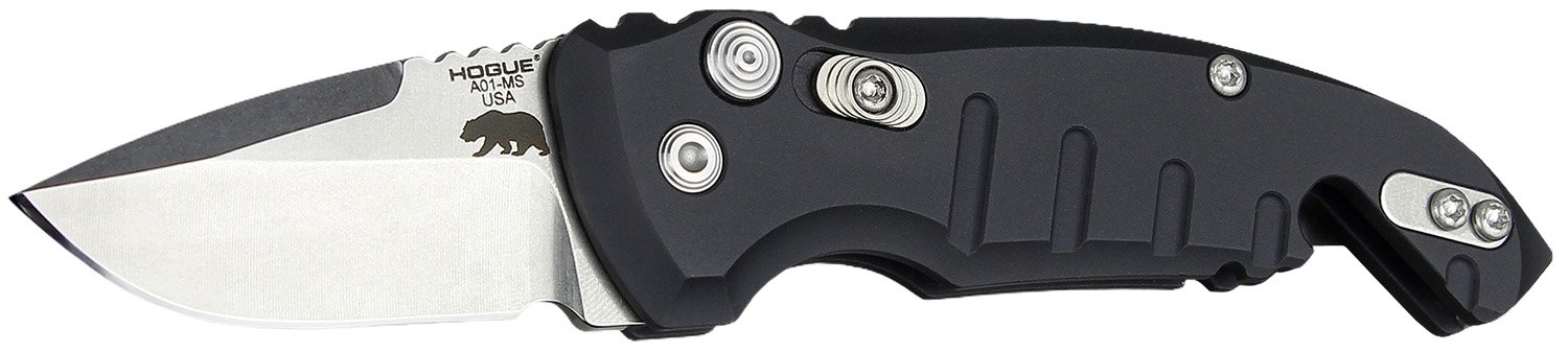 Hogue A01 microswitch folder with a 1.95″ drop point blade, matte black aluminum frame. Built in bottle opener.