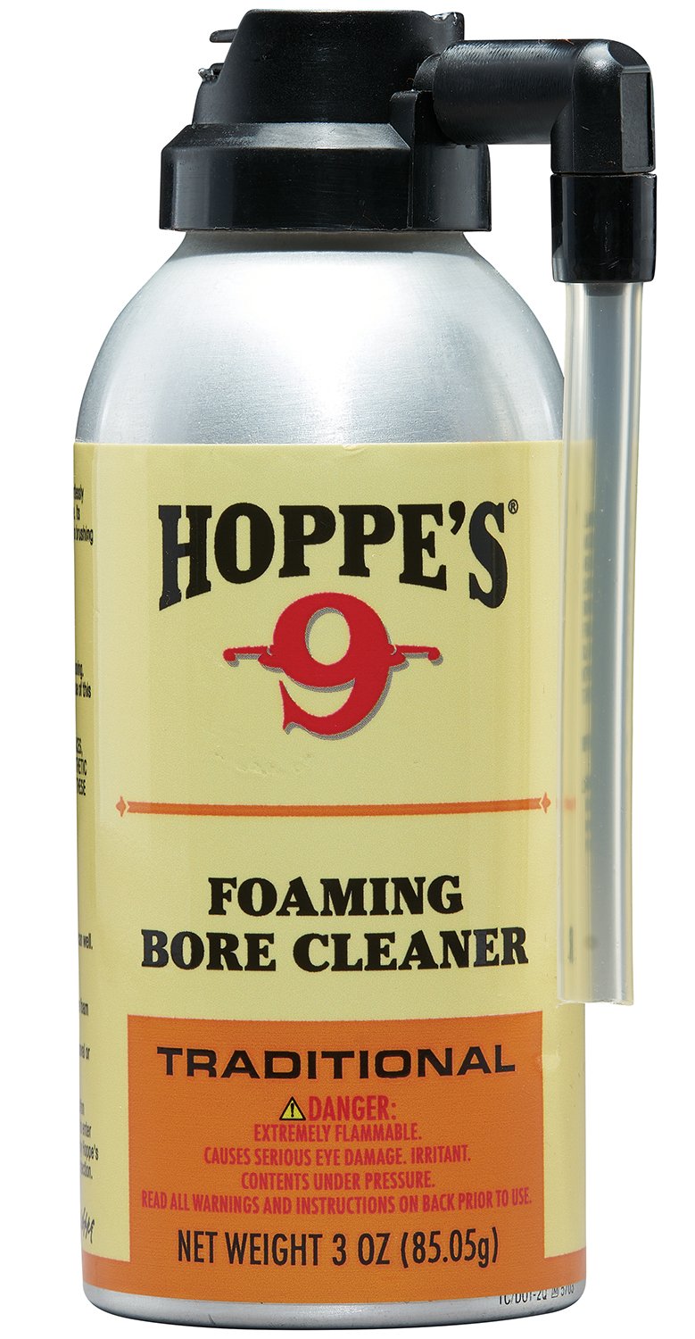 The Hoppe’s No. 9 Foaming Bore Cleaner quickly and effortlessly dissolves and removes copper and powder residue. Its superior cleaning formula does the work for you, no brushing or other mechanical cleaning necessary. Orange foam will turn blue indicating copper removal or black indicating powder removal.