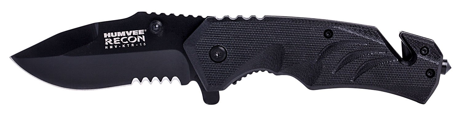 The HUMVEE Recon Knife features a partially serrated, black stainless steel blade, metal pocket clip, thumb stud and is spring assist. These products are designed to survive the most demanding situations while still remaining simple and easy to use.