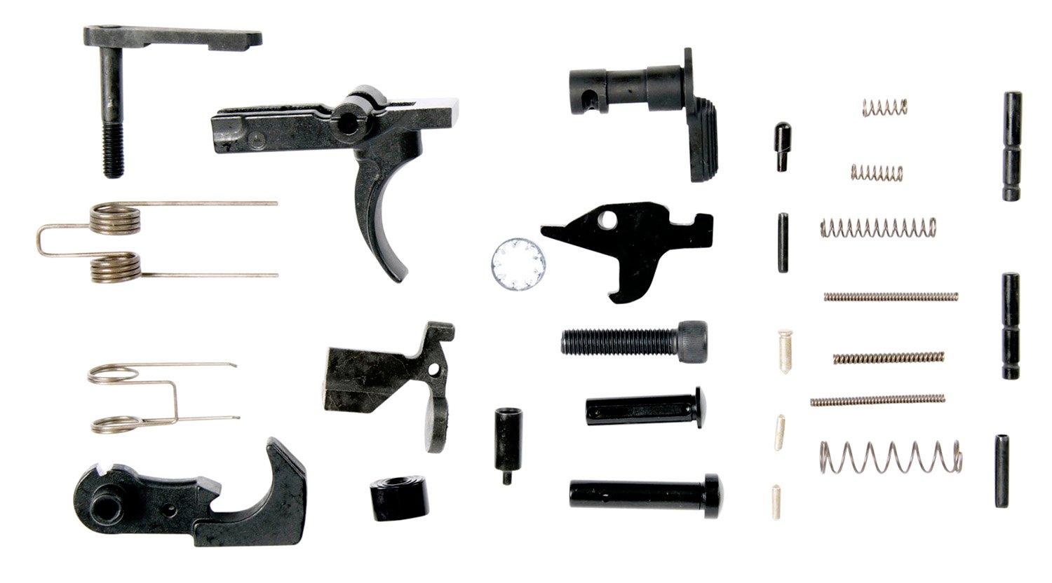 The LBE AR15 Lower Parts Kit includes the following: Trigger Guard Roll Pin; Pistol Grip Screw & Lock Washer; Disconnector & Spring; Trigger, Spring, & Pin; Hammer, Spring, & Pin; Bolt Catch, Buffer, Spring & Roll Pin; Magazine Catch & Spring; Magazine Release Button; Selector, Detent, & Detent Spring; Takedown Pin, Pin Detent, & Pin Detent Spring; Pivot Pin, Pin Detent, & Pin Detent Spring; Buffer Retainer & Retainer Spring.