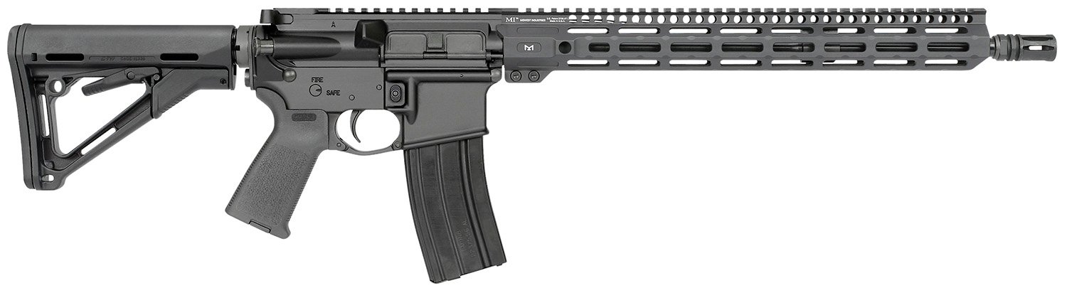 Forged from 7075 T6 aluminum, Precisely machined to M16/M4 specs, M4 feed ramps, Hard-coat anodized mil 8625 type 3 class 2 finish, .250 take down pins, MI M16 bolt carrier group, MI-CRM15″ Combat series handguard, M-LOK(TM) compatible, Laser engraved T-marks, Lightweight Melonite barrel, 16 inch, 1/8 twist, .223 Wylde chamber, Mid-Length gas system, .625 diameter barrel, A2 flash hider, Works with standard AR15 components and magazines, Receiver rear takedown pin detent hole threaded for a 4-40 set screw, Mil Spec diameter buffer tube, Magpul(R) CTR(R) buttstock, Magpul(R) MOE(R) grip, Heavy Duty Quick Detach End Plate MI-HDEP