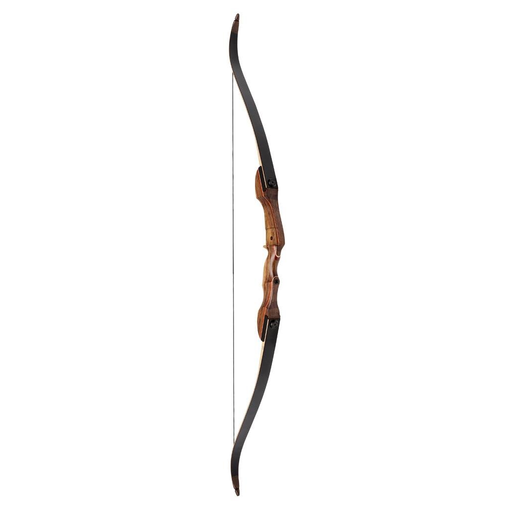 Three piece take-down recurve bow crafted from hand selected hardwoods. Features a slim grip riser and limbs with reinforced limb tips. Equipped with bushings for sight, plunger, and stabilizer. Includes Dacron string as well as standard and toolless limb bolts.