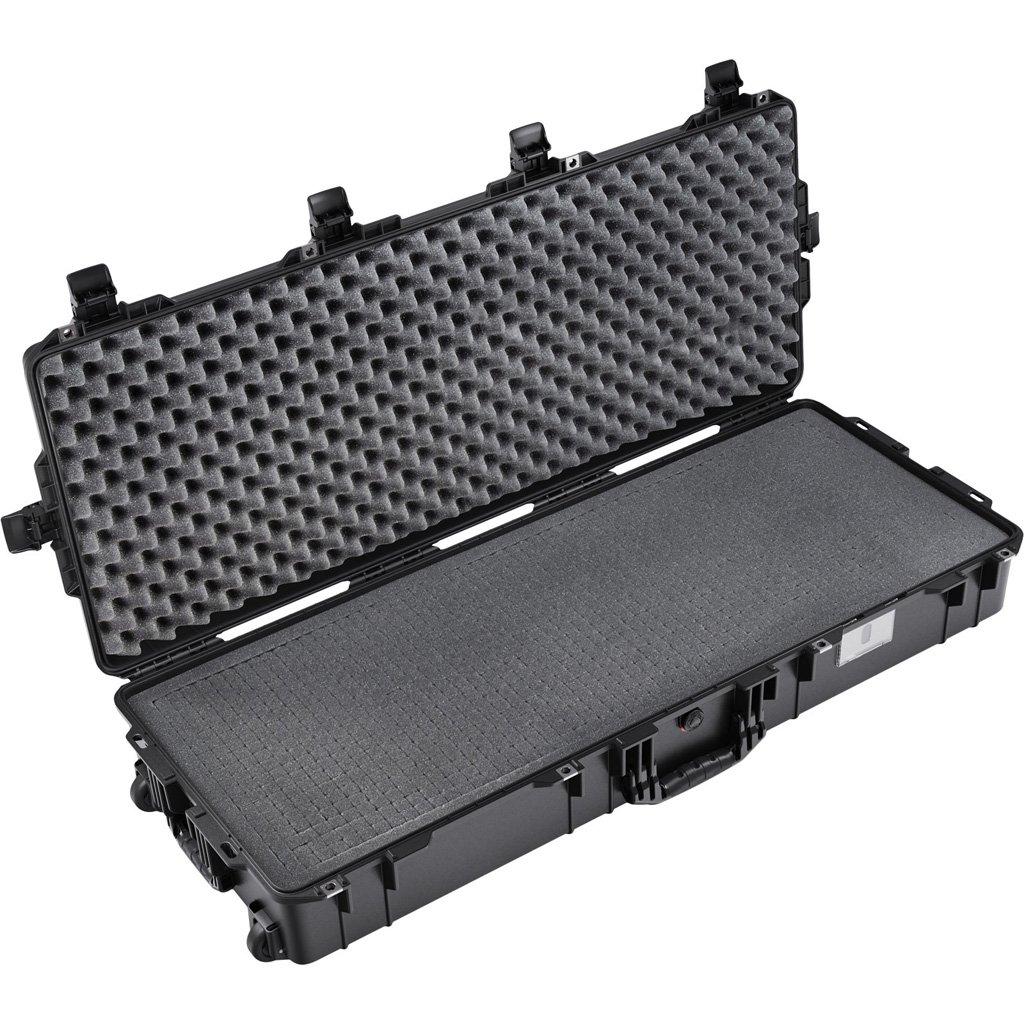The Pelican Air 1745 case is a long-form hard case designed to protect extended gear such as survey tools, firearms, tripods, and other lengthy equipment. Measuring about 44 inches with built-in wheels, it is up to 40 percent lighter than many comparable polymer cases for easier transport. With about 8 inches of internal depth, it is the deepest long case in the Air line and supports stacking items on both lower and upper layers. It can be configured with two layers of custom foam or standard Pick N Pluck foam and features Press and Pull latches that stay secure under impact yet open easily on arrival.