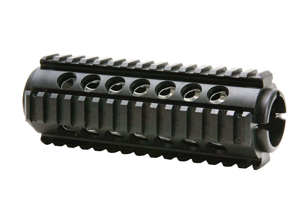 ProMag Quad Rail Hand Guard two piece MIL-Spec Picatinny rails at the 12, 3, 6 and 9 o’clock positions. Used for mounting sights, tactical lights, vertical grips and other accessories. Constructed of a high impact glass filled nylon polymer with integral aluminum heat shield inserts.