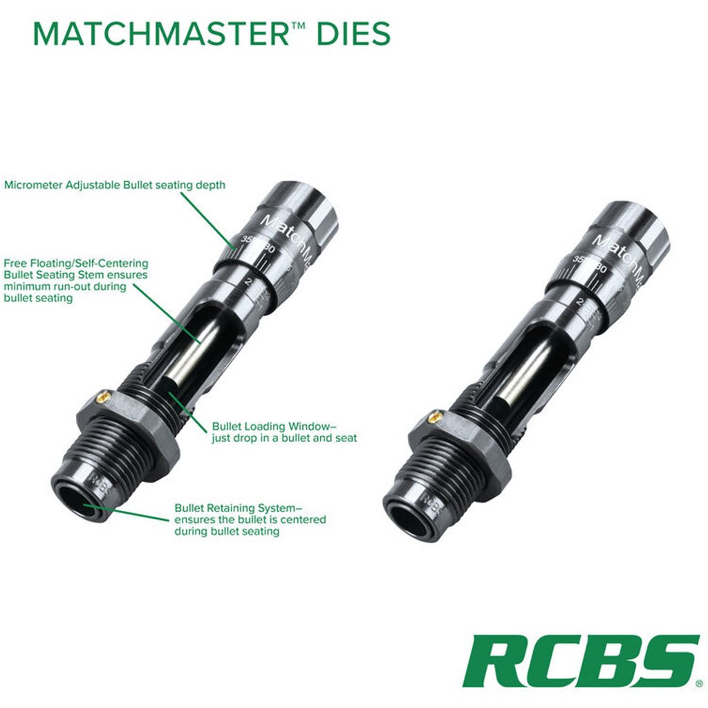 The RCBS MatchMaster Competition Seating Die offers unmatched precision and ease for reloaders. Crafted from case-hardened steel and finished with a deep blued polish, it ensures durability and a premium appearance. Its oversized micrometer adjustment knob allows for precise seating depth to within a thousandth of an inch, while the innovative bullet seating window with retention system simplifies alignment and eliminates the risk of misaligned bullets. Designed with a free-floating, self-centering bullet seating stem, this die delivers astoundingly concentric results for consistent and reliable performance.