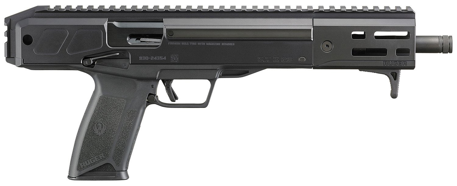 The LC Charger pistol utilizes the same steel magazines and familiar ergonomic controls as the Ruger 5.7 pistol. Utilizes Ruger’s safe, reliable and proven Secure Action fire-control system that combines a protected internal hammer with a bladed-safety trigger. Featuring a 10.30″ nitride treated steel threaded barrel; ergonomics with ambidextrous manual safety; reversible charging handle; ergonomic bolt release; extended magazine release latch; handguard with M-LOK accessory attachment slots; multiple QD sling sockets; Picatinny rail for optic mounting; 1911-style ambidextrous manual safety; an integrated trigger safety; neutrally balanced sear with significant engagement and strong spring tension; and hammer catch to help prevent the hammer from contacting the firing pin unless the trigger is pulled. Includes one 20rd steel pistol magazine and hex wrench for disassembly.