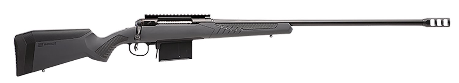 Savage’s 110 Long Range Hunter model is designed for extreme-range precision. It features Savage’s AccuFit synthetic stock with five comb riser sizes for the perfect cheek-to-stock weld, four composite inserts to establish your unique length-of-pull, and AccuStock. The AccuStock consists of a rigid rail system firmly embedded in the stock throughout the foreend of the rifle. It also engages the action three dimensionally along its entire length. The 110 Long Range Hunter also features AccuTrigger for flexibility, a threaded carbon steel barrel, soft grip fore-end and pistol grip, and a hinged floorplate magazine. This 338 Lapua Magnum model has a 26″ matte black button-rifled barrel with and adjustable muzzle. It also has a gray finish stock.