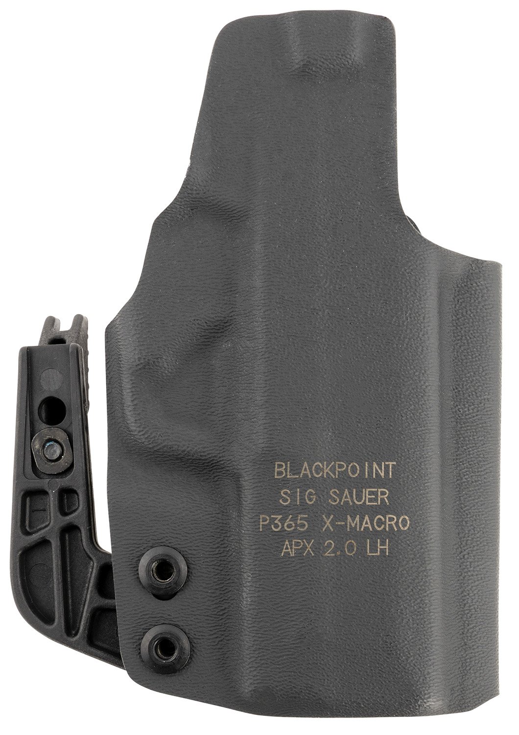 The P365-XMACRO IWB BlackPoint Tactical holster has been designed to be a minimal appendix carry holster that can be easily configured to be worn comfortably in any IWB, strong-side position. It features a concealment strut that acts as a lever on the holster against the inside of the belt, pressing the firearm’s grip into the body and aiding in concealment. The concealment strut has built-in height adjustment allowing it to be moved to match the users belt height. Features an adjustable double-finger metal belt clip to prevent unwanted removal. This holster has a factory optic relief cut to allow the use of ROMEOZero where desired. The screws underneath the trigger guard allow the user to easily adjust the tension on the holster within a set range. The belt clip rides on a strong custom formed Kydex wing for more comfortable carry, allowing the holster to flex just the right amount.