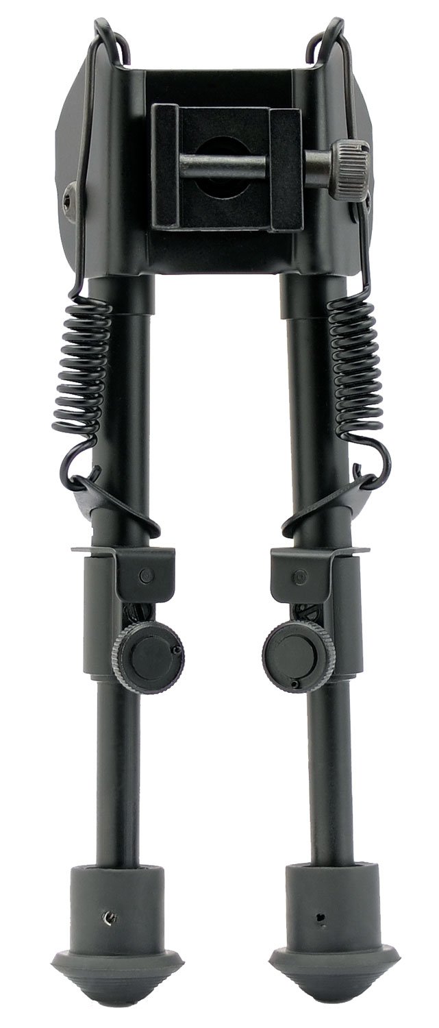 SME’s Shooting Bi-Pod with Spring features a clamp mount for easy attachment to firearms with picatinny/weaver style rail. It is supplied with butt stud adapter to attach to firearms with a standard butt stud and an additional butt stud on adapter for swivel attachment. The adjustable spring-loaded legs are constructed of anodized 6061-T6 aluminum with a spring locking knob and soft rubber feet for stability. This model has a black finish and is 6-9″ long.