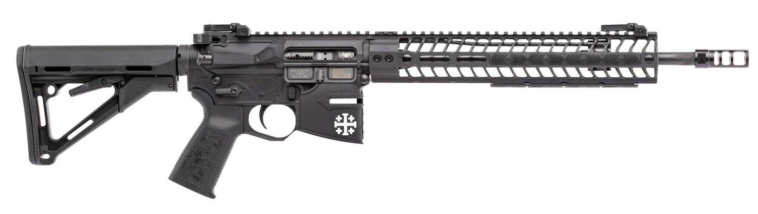 This Rare Breed Crusader features a 7075 T6 aluminum receiver with a black hardcoat anodized finish, 14.5″ cold hammer forged barrel with a black phosphate finish, 12″ M-LOK rail, and a Magpul CTR stock.