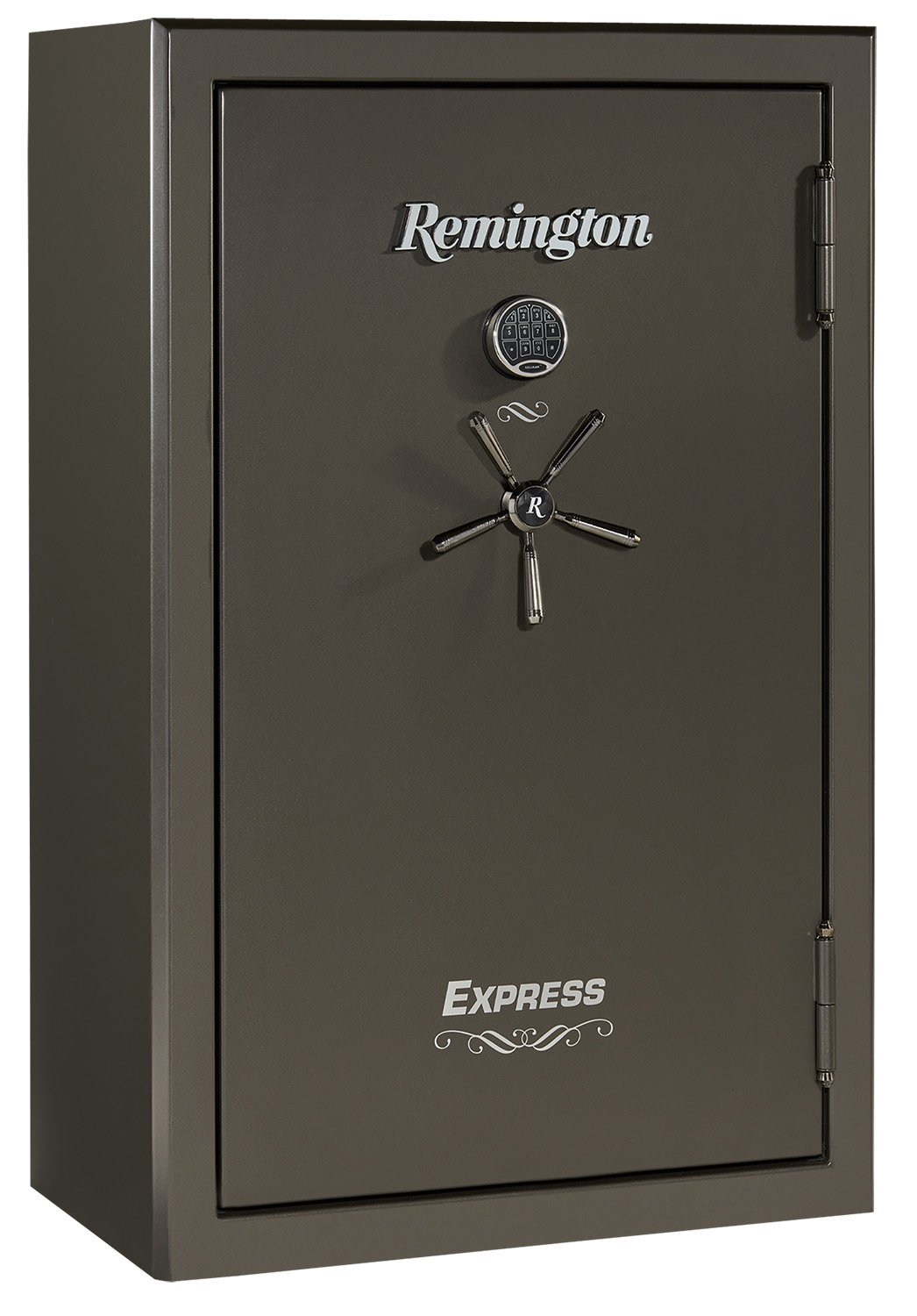 The Remington Express 44-Gun Safe is prepared for the elements with a 12-gauge industrial steel body and Triple Seal technology This fireproof and waterproof safe is one to depend on to keep firearms and valuables protected. Backed by a high-performance SecuRam UL Rated electronic lock, twelve robust steel locking bolts, and a relocker device for maximum in-home security. Motion-activated LED lights come installed inside the safe for easy access in low light conditions. The fully carpeted interior features ample storage with the deluxe pocket door organizer, barrel rests, and adjustable side shelves. Keep gun safe accessories charged with the integrated UL Rated dual power outlets and two USB ports. Includes a waterproof bolt-down kit for use with the four pre-drilled holes and our best-in-class Lifetime Warranty that covers your entire Remington safe against theft, fire, natural flood, locks, parts, and paint.