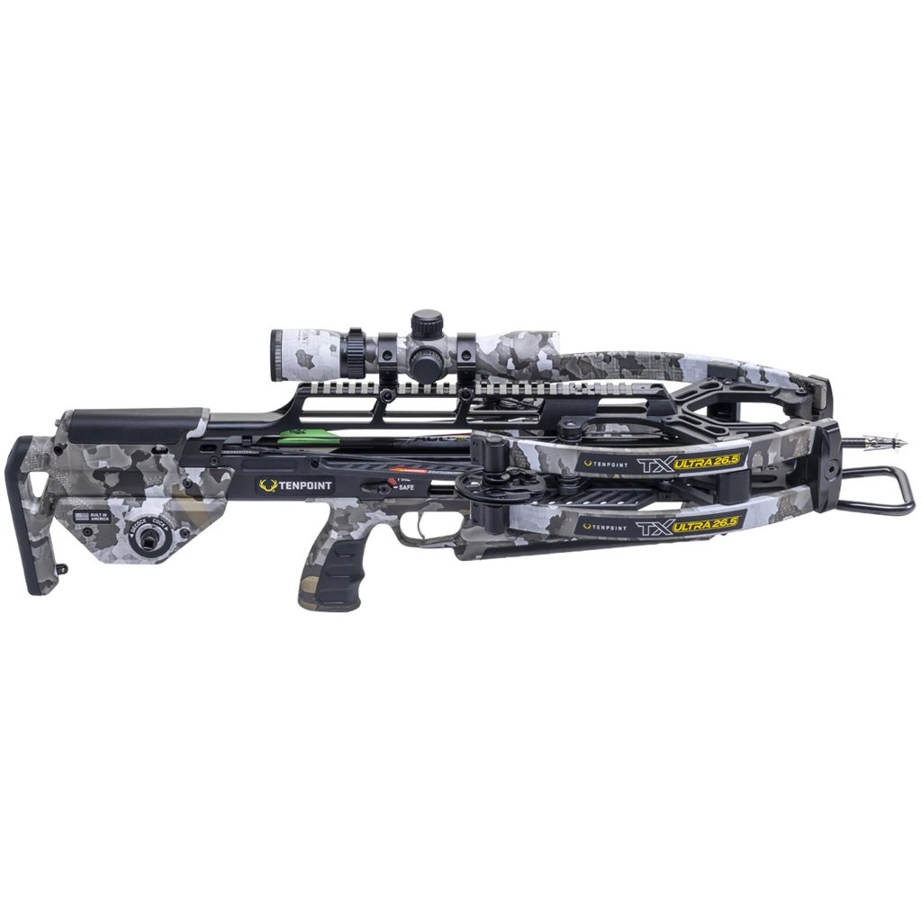 The TX Ultra 26.5 is a forward-draw crossbow measuring 26.5 inches long and 7 inches wide, with a rated speed of 410 fps. It features Twin-Riser Technology, a TriggerTech trigger, and an AR-style ambidextrous thumb safety, along with a rail-less ZERO-Trac barrel and an ACU-Lock Scope Bridge. Zero-Torsion Technology combines 0.315-inch axles and X-Wide limbs to reduce torsional movement for consistent shot-to-shot performance. This package includes ACUslide MAXX for cocking and de-cocking, a 100-yard RangeMaster 100 Scope, a 3-pack of ACU-X 20 carbon arrows, plus an integrated string stop, quiver, and bow hanger.