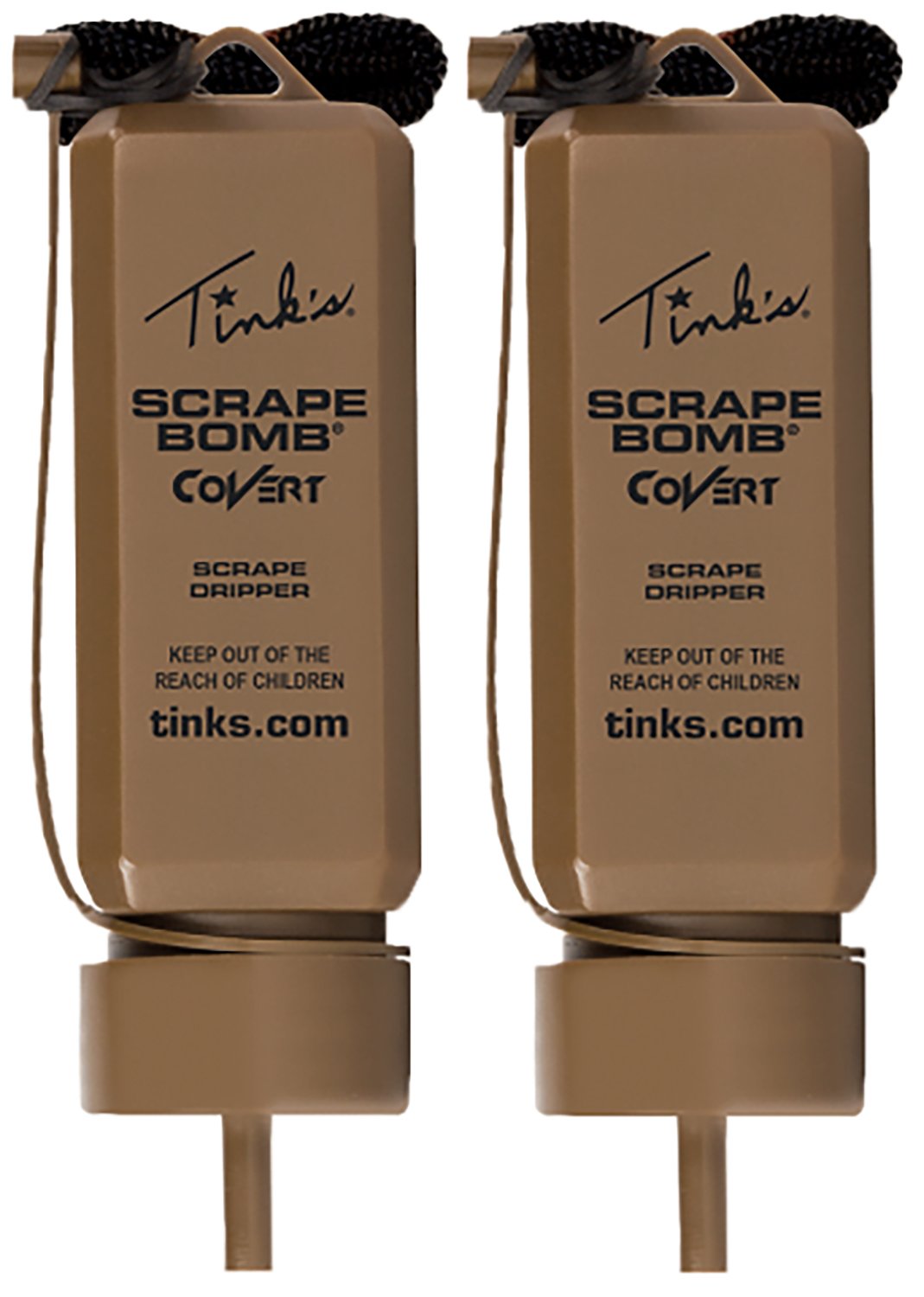 Combo pack of two Tinks Scrape Bomb Drippers. Scrape Bomb works with changes in temperature and barometric pressure, causing it to drip during the daylight hours. Use over mock or natural scrapes to encourage repeat visits. Earth brown color allows dripper to blend into the surroundings. Drip-rate based upon changes in temperature and barometric pressure. Each dripper holds 2-ounces of lure. 2 ounces will last approximately 1 week. Easy way to set up multiple mock scrapes. Designed to drip during the day. Pack of two Drippers
