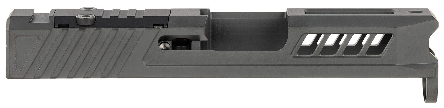 The Axiom Slide offers a sleek design with lightweight side-cut windows and a top-milled pocket for enhanced aesthetics and performance. The slide boasts advanced aggressive reduced and scalloped front and angled rear serrations providing a superior grip and making it easy to use. Equipped with an optic cut footprint, it’s ready for various Trijicon RMR and Holosun optics.