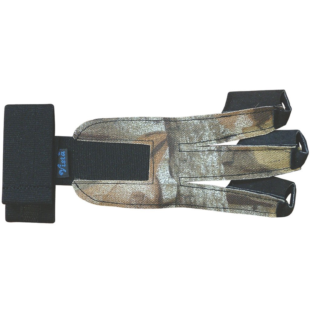 Shooting glove with slick long lasting mega hide finger tips. Elastic over the knuckle eliminates finger twist. It has a wide wrist strap and is in camo. Fits right or left handed archers.